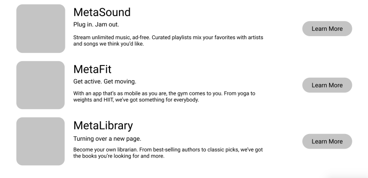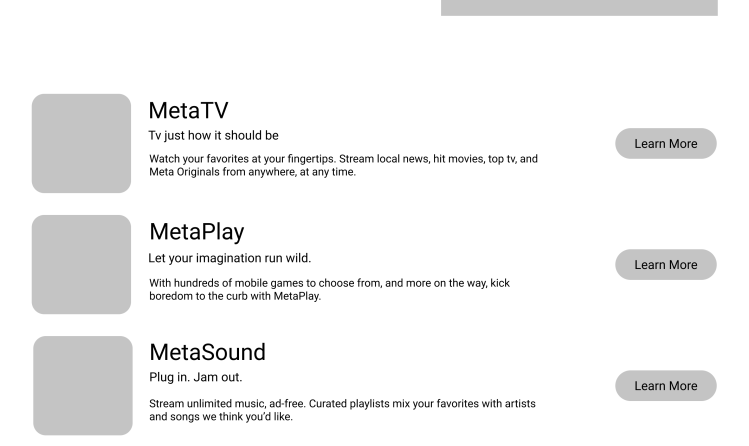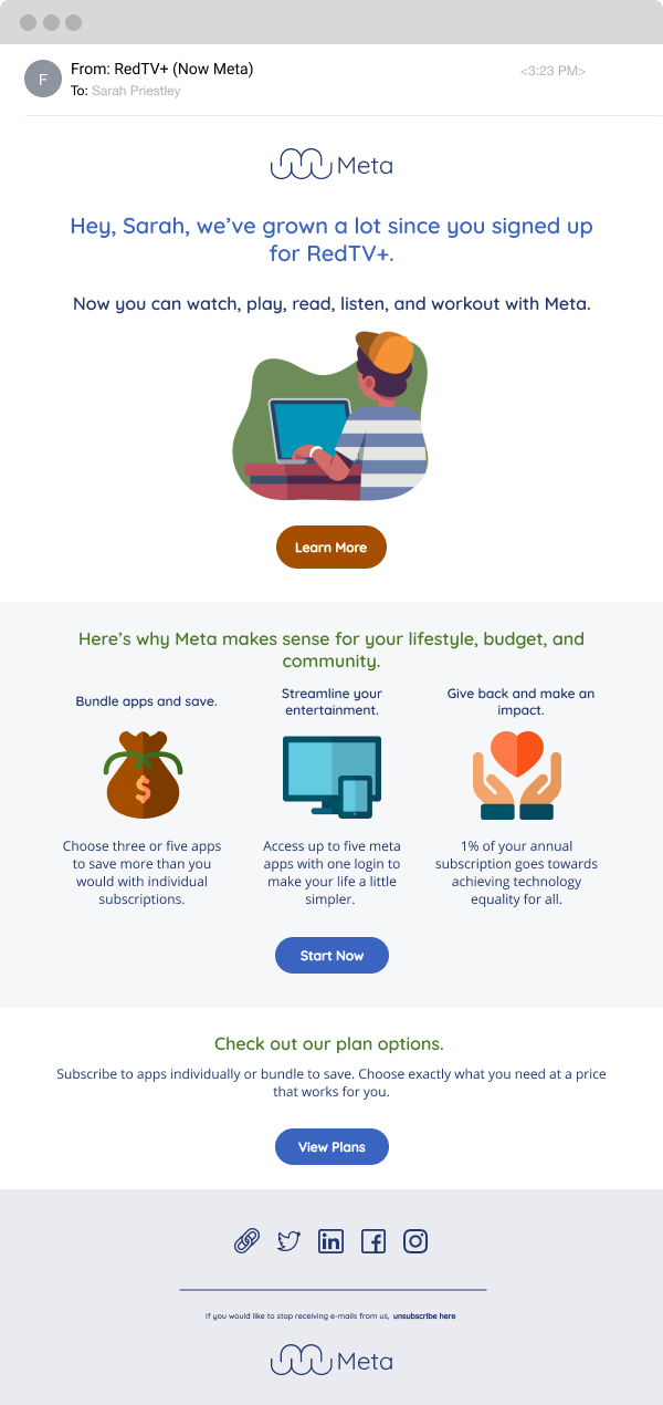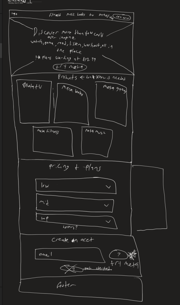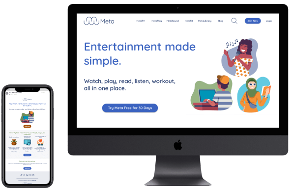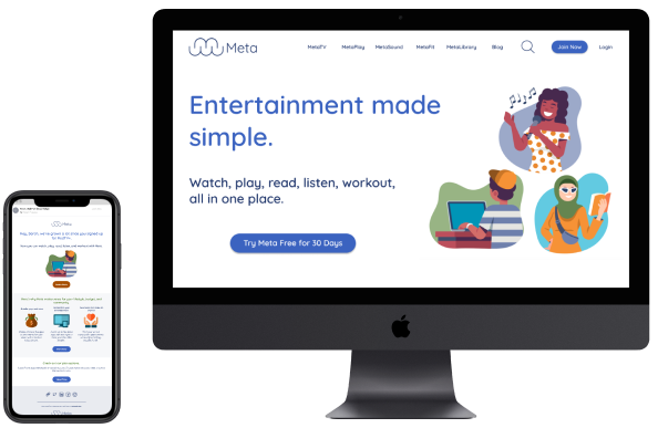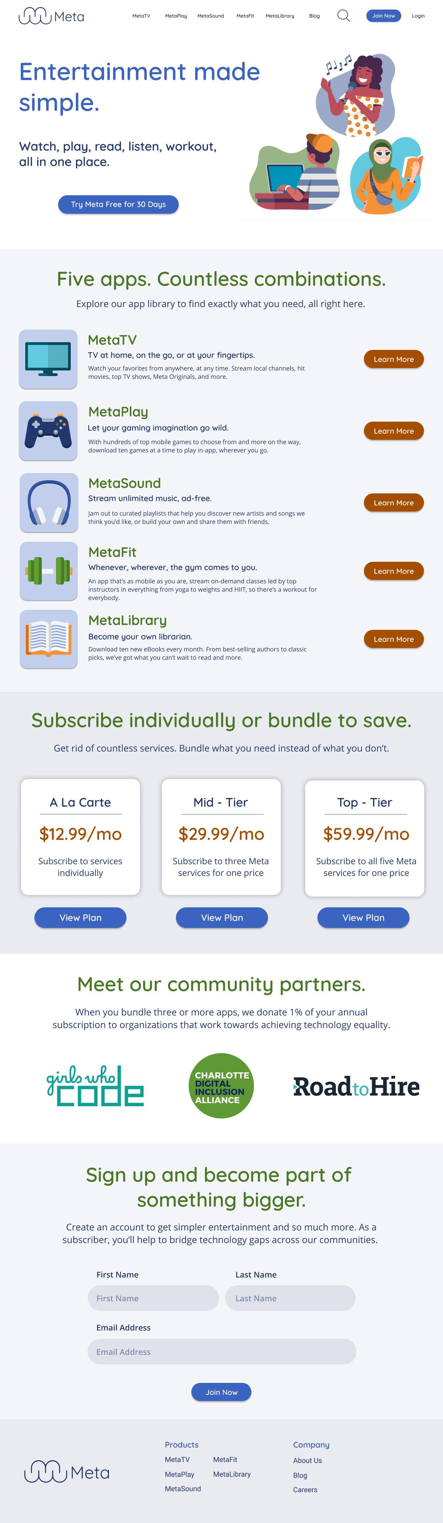 Meta is a concept brand with five sub-brands. These five sub-brands include: Fitness, App Games, Music, TV, and E-books. During this case competition at my internship with Red Ventures, my team of two copywriters and I created the look and feel for the brand, a landing page, and a re-targeting email. I was responsible for all of the visual design for the landing page and re-targeting email and my teammates worked on all of the content for both. Together the three of us collaborated together on the brand tone and voice.