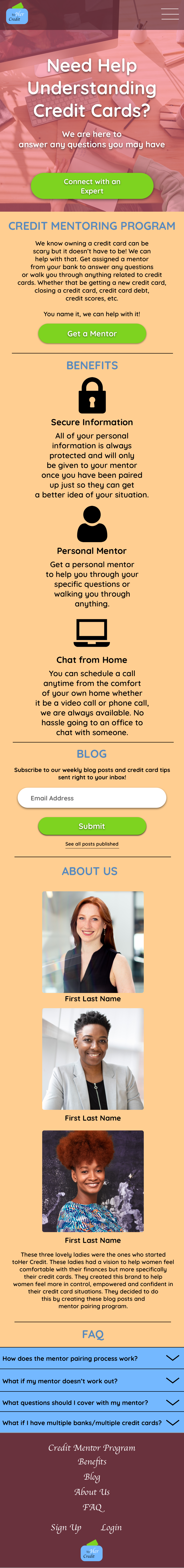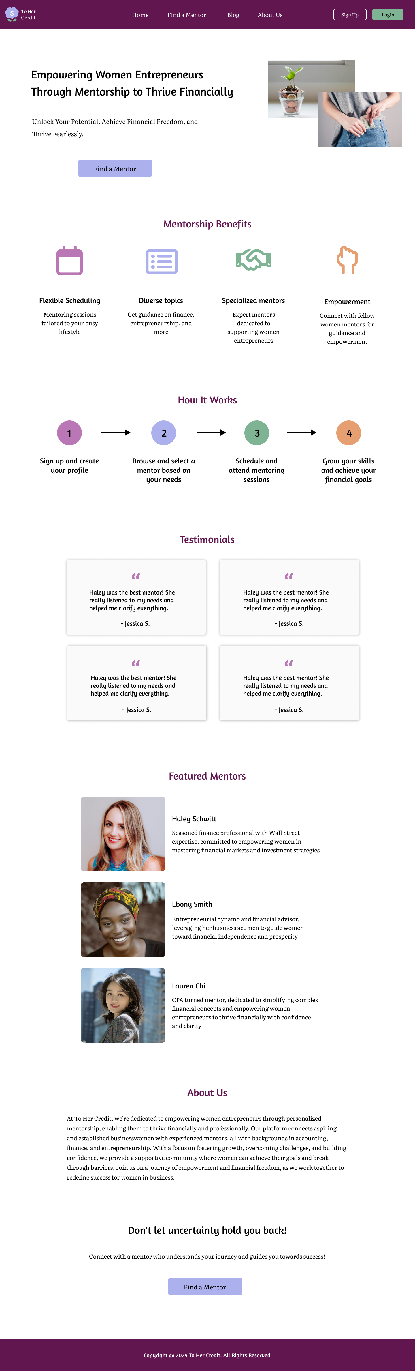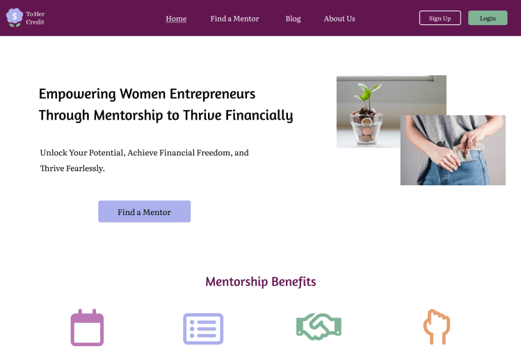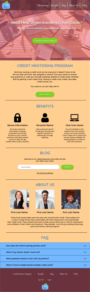 ToHer Credit is a fictitious concept mentoring program developed to support women entrepreneurs in their business ventures. Inspired by the “To Her Credit” blog hosted on CreditCards.com, the platform aims to empower women entrepreneurs with financial knowledge and guidance tailored to their specific needs. The design challenge is to create a user-friendly platform facilitating connections between women and mentors, providing the guidance needed for financial success.